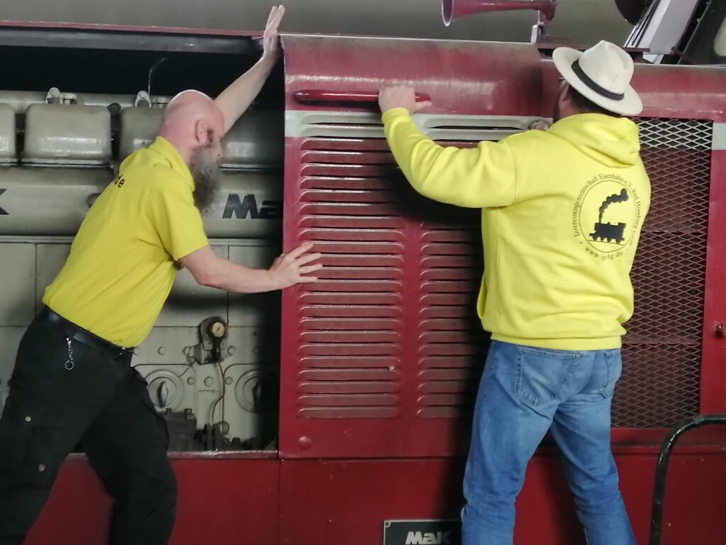 Und nachdem es den ganzen Tag eher um Dampfloks gegangen war, durften auch mal die „Dieselmänner“ ran und begutachteten eben jenen Motor der Rangierlok des Hessenscourrier.